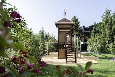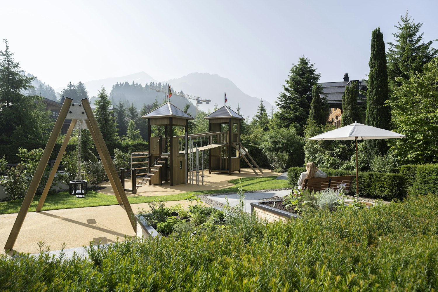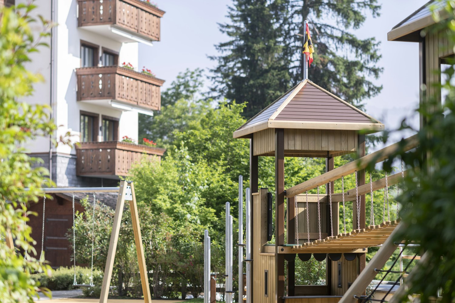 Die Kinder können zwei charmante Türme erkunden, die an The Alpina Gstaad erinnern, eine Hängebrücke überqueren, inspiriert vom ikonischen Peak Walk, und auf Rutsche, Schaukeln und Kletterelementen nach Herzenslust spielen.