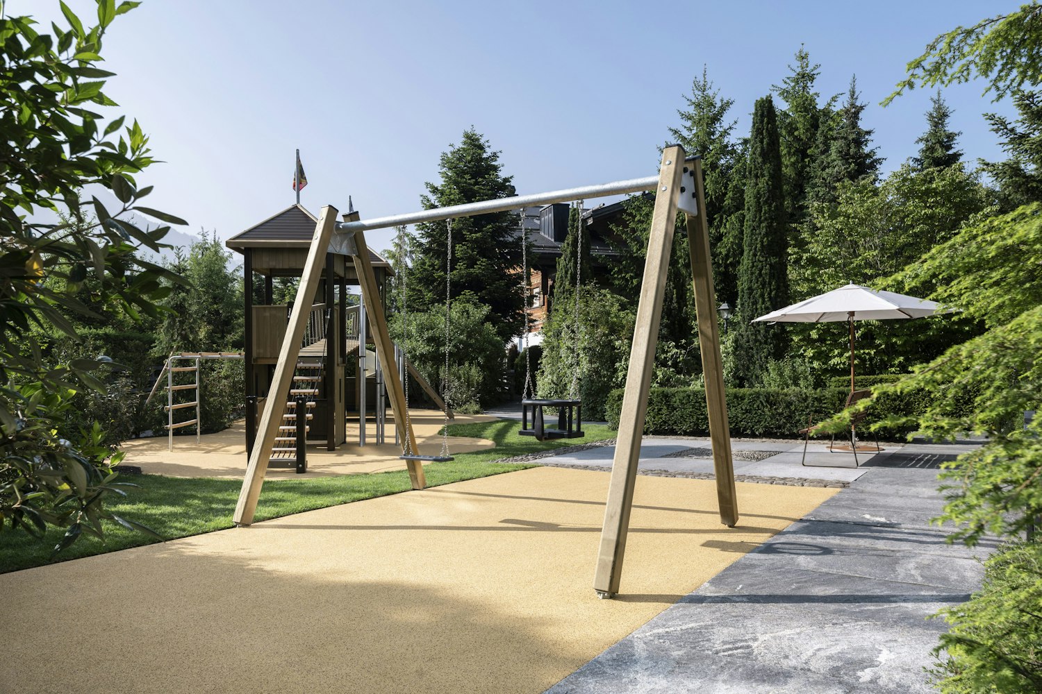 Unser brandneuer Aussenspielplatz ist ein wahres Paradies für kleine Entdecker. Eingebettet in unsere Gartenanlage – nur wenige Schritte vom Pool und den Restaurants entfernt – bietet dieser liebevoll gestaltete Spielbereich ein Spielerlebnis, das von der beeindruckenden Alpenlandschaft inspiriert ist.