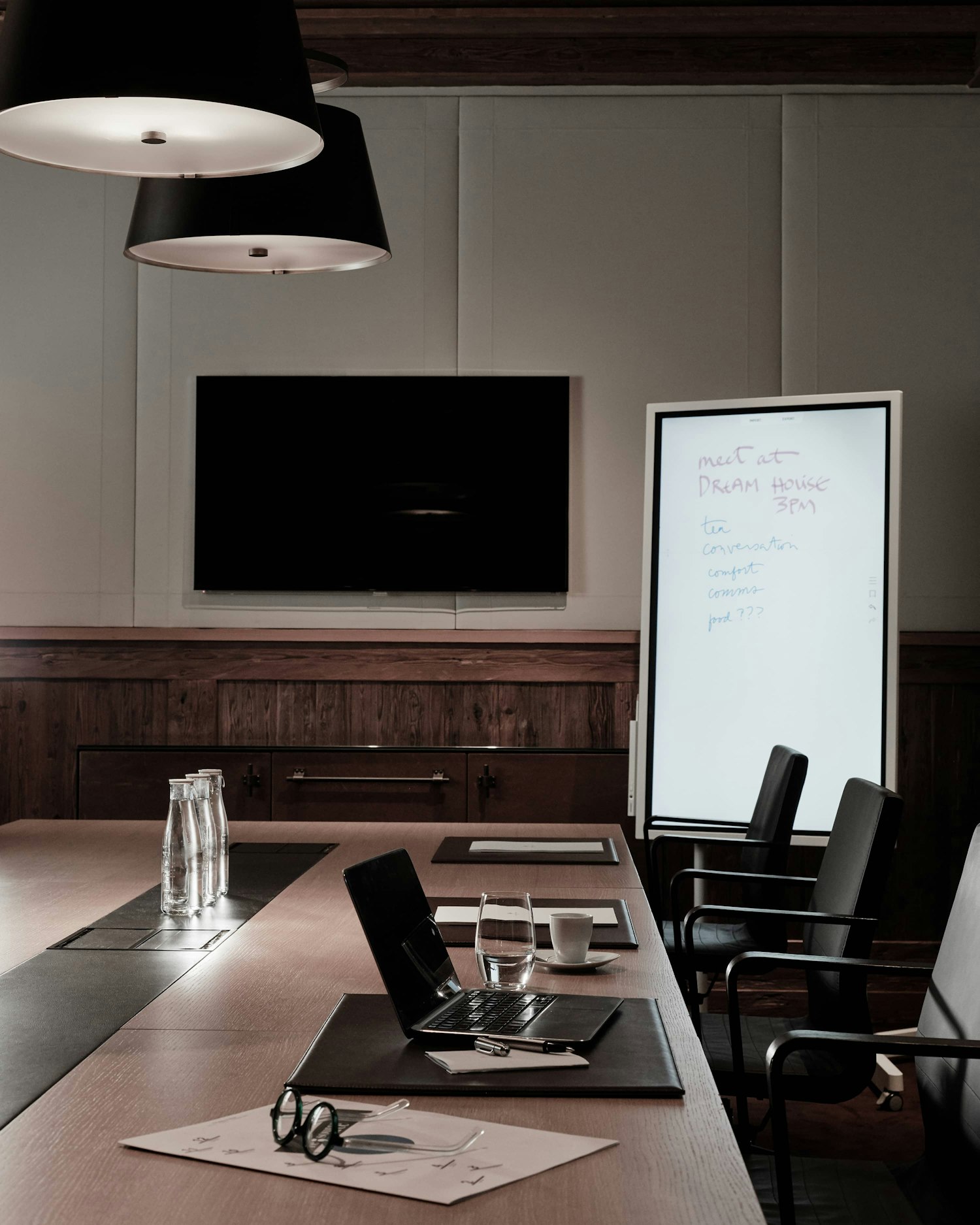 Ihnen stehen zwei eingerichtete Konferenzräume mit massgefertigtem Konferenztisch und hochwertigen Bürosesseln zur Verfügung. Die Räume sind mit aktuellem technischem Equipment ausgestattet: Flachbildfernseher der neuesten Generation und digitale Whiteboards sowie drahtloses High-Speed-Internet.