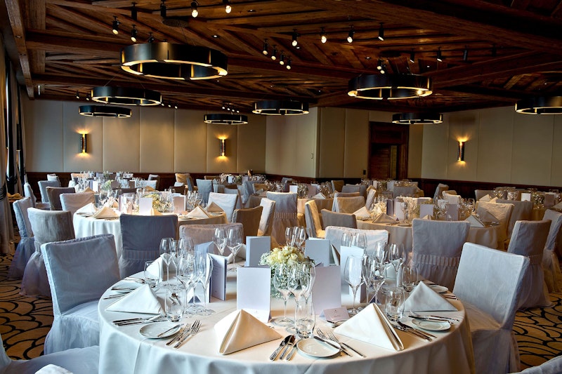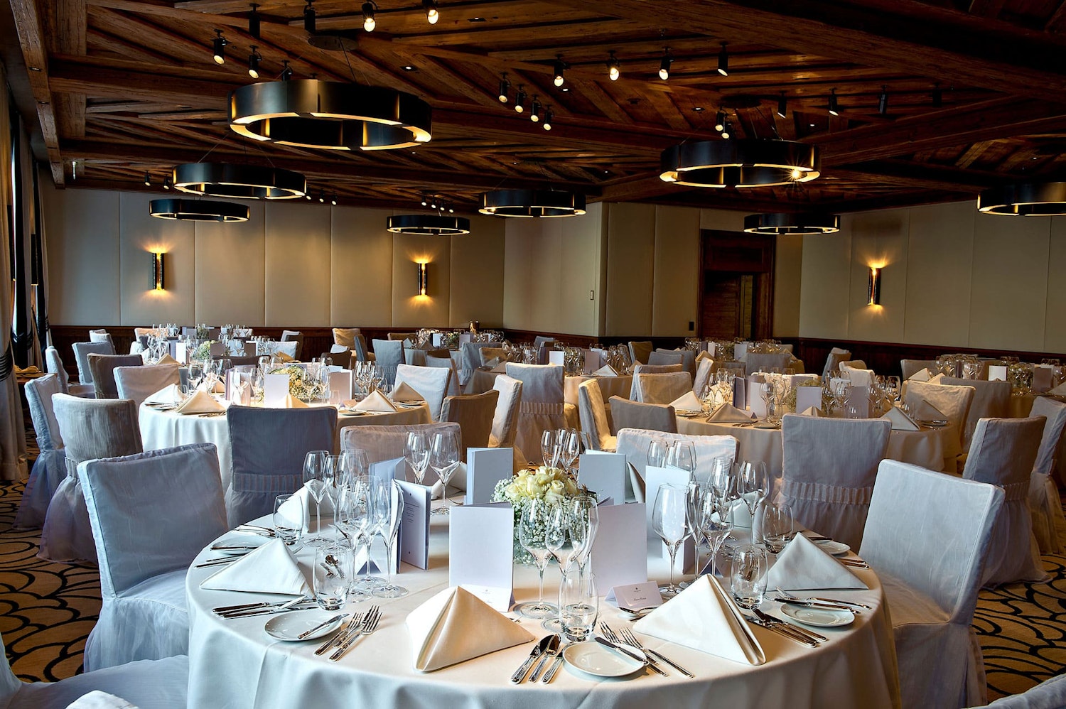 Der zentral im Eingangsgeschoss des Hotels gelegene, weitläufige Ballsaal bietet den idealen Rahmen für verschiedene Events. Traditionelle Saanenländische Handwerkskunst vereint sich hier mit modernster Technologie. Massgefertigte schmiedeeiserne Leuchter unterstreichen das elegante Design der holzvertäfelten Decke. Grosszügige Fenster geben den Blick auf die nördlichen Berggipfel frei. Und die moderne Technik, wie Bildschirme und verstellbare Deckenstrahler, kann per Fernbedienung ganz einfach unsichtbar gemacht werden.