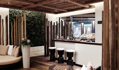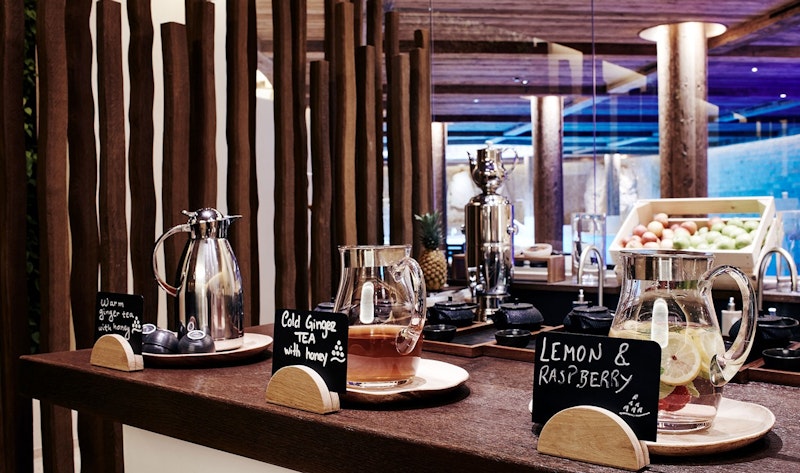 Die Saftbar befindet sich ganz in der Nähe des Pools und lädt mit einem vertikalen Garten sowie bequemen Sofas und Betten zum Verweilen ein. Sie ist der zentrale Treffpunkt des Spas, an dem die Gäste zusammenkommen und sich mit frischen Säften, gesunden Kräutertees oder Wellnesswasser entspannen können.